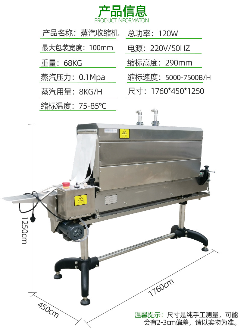 - 蒸汽收縮機配備智能控制系統(tǒng),可以根據(jù)包裝產(chǎn)品的大小、薄膜的厚度等因素自動調(diào)節(jié)蒸汽的用量。例如,當包裝較小的產(chǎn)品或者較薄的薄膜時,系統(tǒng)會自動降低蒸汽流量和溫度,避免過度使用蒸汽。通過這種智能控制,可使能源消耗降低 10% - 20%。