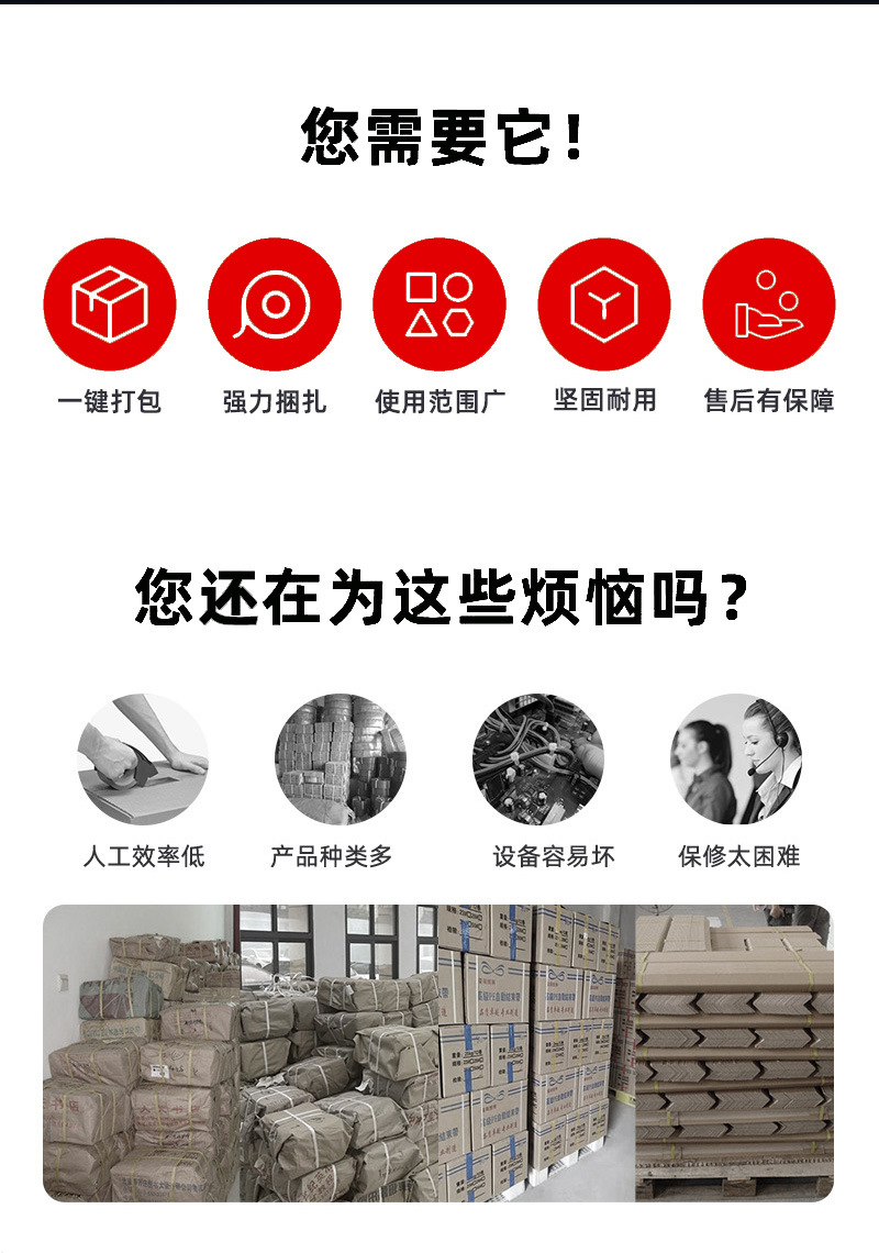 - 要求:制造業產品種類復雜,有小型零部件,也有大型設備,對打包機的承載能力和打包尺寸范圍要求較寬。而且,對于一些高精度的產品,打包過程不能對產品造成損傷。