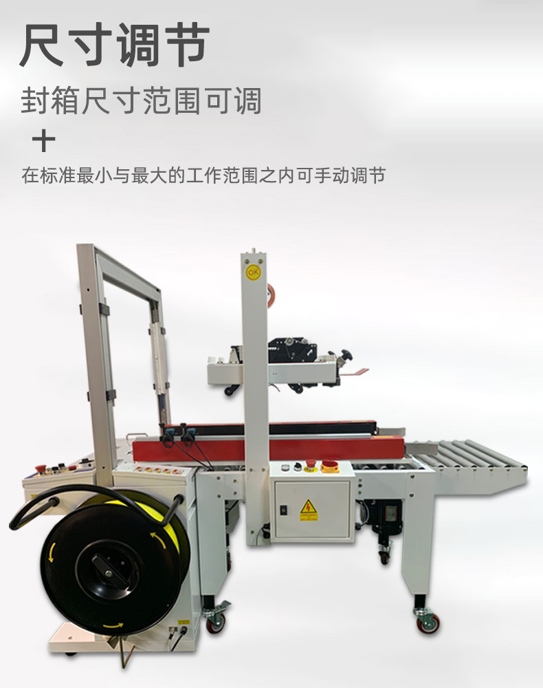 - 快速調節功能:可以根據不同大小、形狀的紙箱,手動或自動調節封箱和打包的尺寸參數,以適應多樣化的包裝需求,且調節過程簡單快捷1.