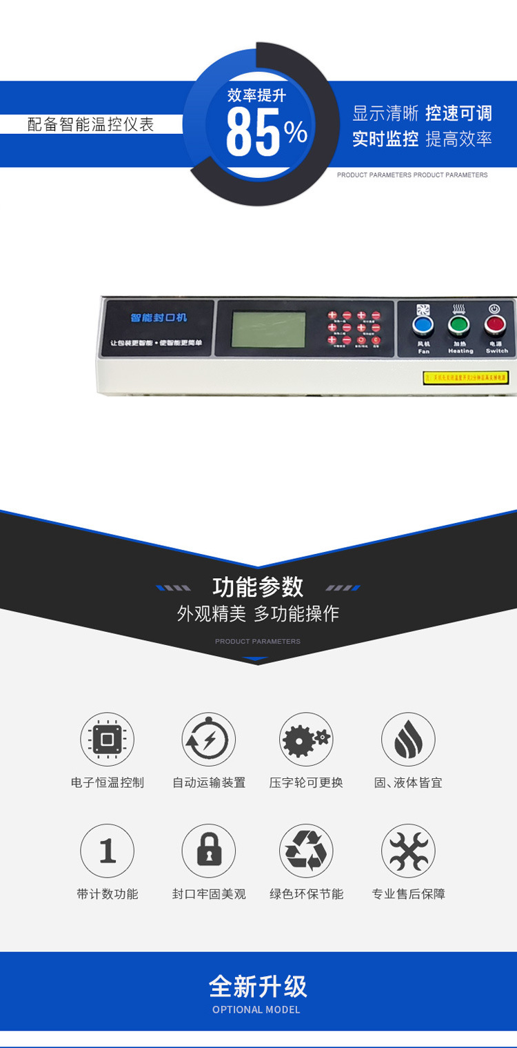 - 靈活性高:可升降功能使其能夠適應(yīng)多種包裝尺寸和厚度,無論是薄型的塑料薄膜包裝還是厚型的紙板箱包裝,都能進(jìn)行有效封口。這種靈活性在產(chǎn)品包裝規(guī)格多樣的生產(chǎn)環(huán)境中非常重要,減少了對(duì)多種不同封口設(shè)備的依賴。