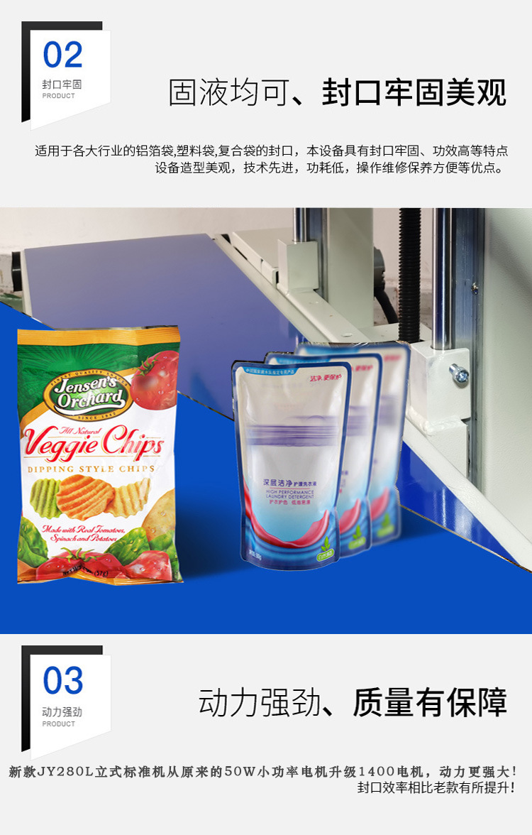 - 立式設(shè)計(jì):這種封口機(jī)采用立式結(jié)構(gòu),機(jī)身通常為直立式框架,相較于臥式封口機(jī),它在空間利用上更具優(yōu)勢,適合在工廠車間的有限空間內(nèi)進(jìn)行布局。而且立式結(jié)構(gòu)便于產(chǎn)品從上方或側(cè)面進(jìn)料,對(duì)于一些大型、較高或較重的產(chǎn)品包裝,更易于操作和定位。