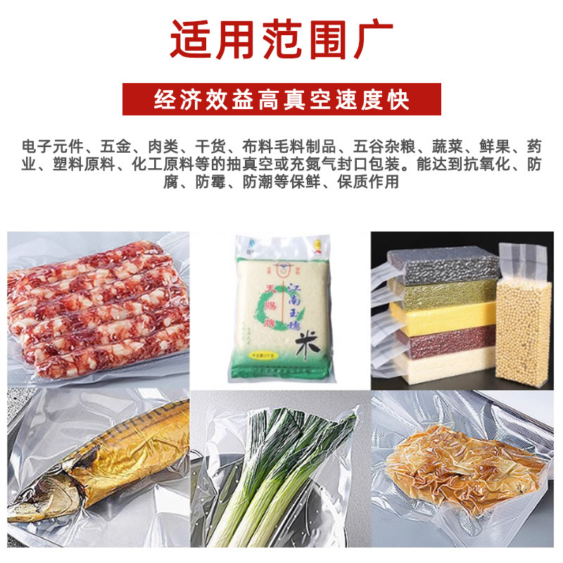 - 食品行業:用于包裝各種食品,如肉類、海鮮、干貨、休閑食品等。例如,在肉類加工廠,可以用它來真空包裝新鮮的肉塊,延長保質期;在干貨生產廠,包裝木耳、香菇等干貨,防止受潮和蟲害。