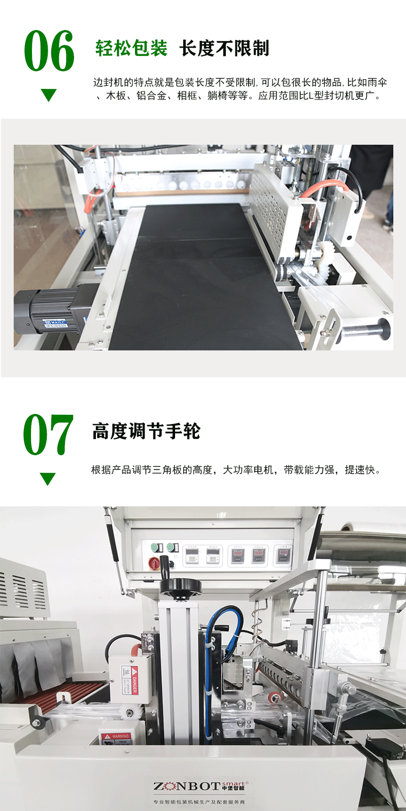 - 負責將待包裝物品平穩(wěn)地輸送通過各個工作區(qū)域,包括薄膜套膜區(qū)、封切區(qū)等。輸送帶的速度通常是可調節(jié)的,以便適應不同的生產節(jié)奏和包裝速度要求。其表面一般較為光滑,以減少對物品和薄膜的摩擦,確保輸送過程的順暢。