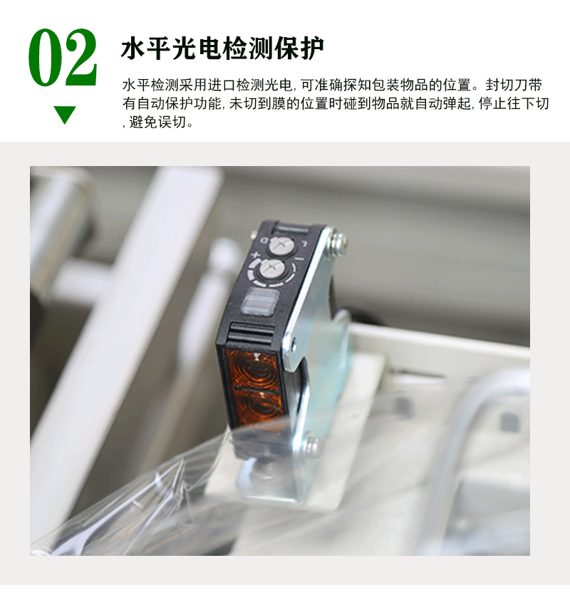 - 通過光電傳感器等設備對物品的位置、姿態(tài)等進行實時監(jiān)測和精準定位。當物品到達預定位置時,會及時向控制系統(tǒng)發(fā)送信號,觸發(fā)后續(xù)的薄膜套膜、封切等操作,確保整個包裝過程的準確性和連貫性。
