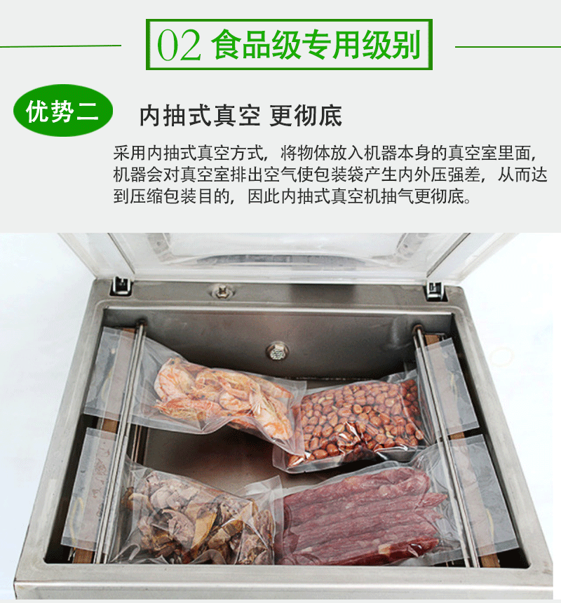 - 憑借精確的封口裝置,單室內抽真空包裝機可以制作出密封牢固、外觀整齊的封口。封口強度高,能夠承受一定的壓力和摩擦,在產品運輸和儲存過程中不會輕易漏氣。