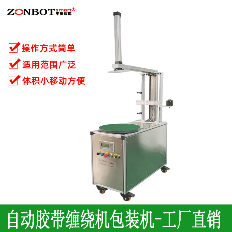 - 工作原理:通過電機驅動轉盤勻速旋轉,貨物放置在轉盤中心位置,依靠摩擦力隨轉盤一同轉動,與此同時,膠帶輸送裝置按照設定的速度、角度、圈數送出膠帶,使其一圈圈緊密纏繞在貨物表面,達到保護、固定、包裝的目的。