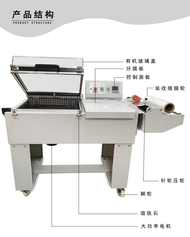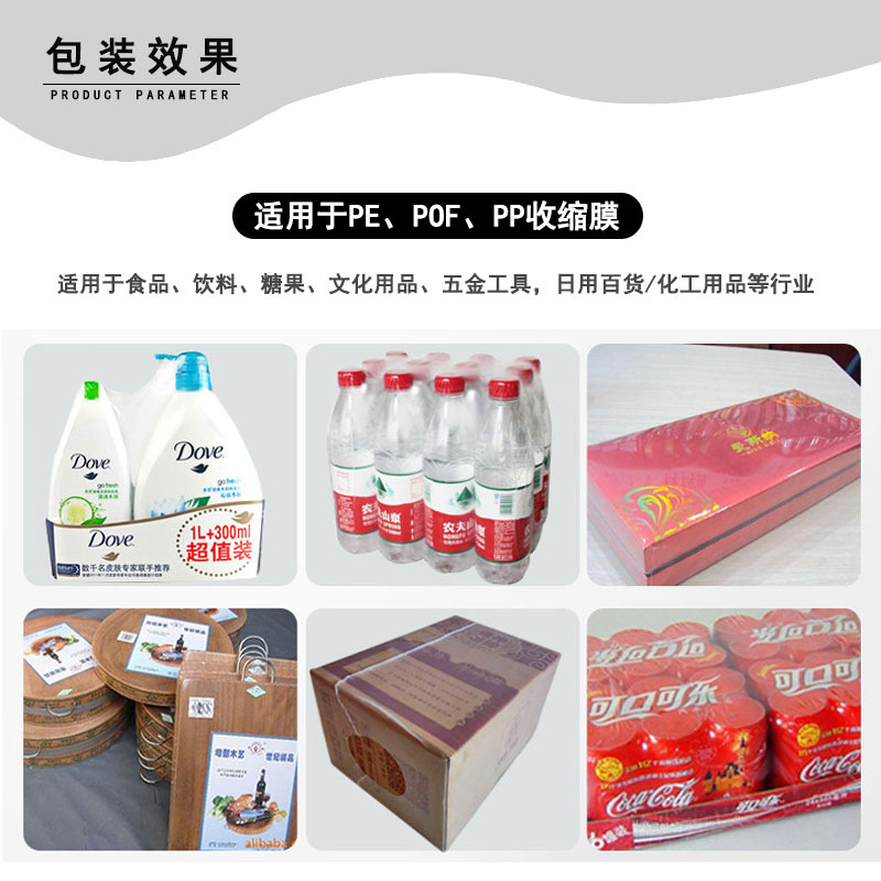 • 適用性強(qiáng):可依包裝物尺寸調(diào)整高低,適用多種規(guī)格產(chǎn)品,能使用 pvc、pof、pp 等收縮包裝材料 。