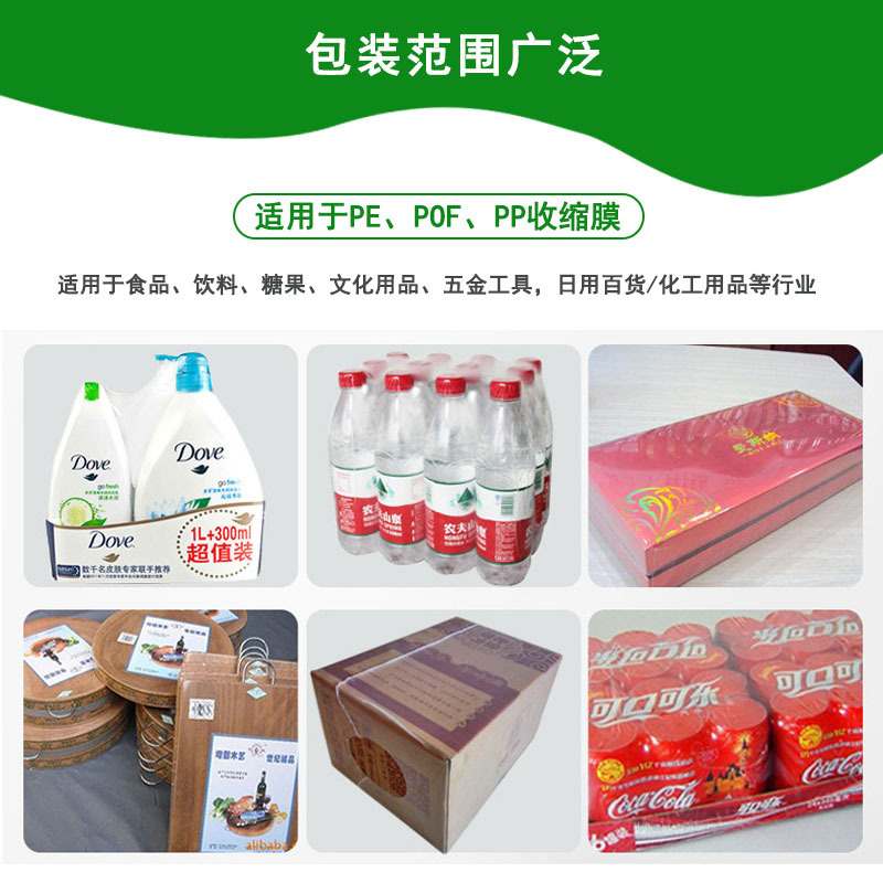 適用于食品、飲料、醫(yī)藥、音像制品、五金、化妝品、書(shū)籍、玩具、塑膠、電子等產(chǎn)品的外包裝及組合收縮包裝 。