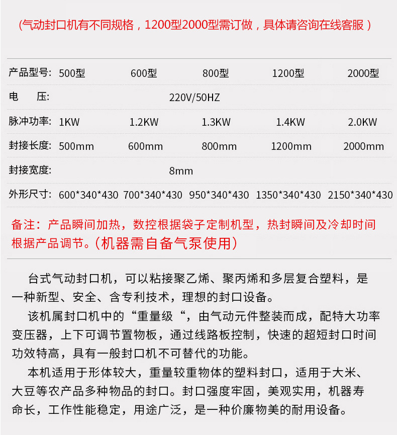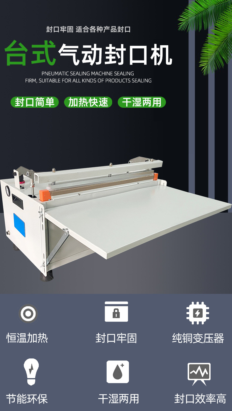 - 設備性能:優(yōu)質的臺式氣動封口機配備高性能的氣動系統(tǒng)和加熱系統(tǒng),能夠實現(xiàn)快速的封口動作和穩(wěn)定的溫度控制。例如,一些高端型號采用先進的氣動元件,響應速度快,氣缸運動平穩(wěn),可有效縮短封口周期。同時,高效的加熱系統(tǒng)能在短時間內達到并保持合適的封口溫度,提高每次封口的效率。