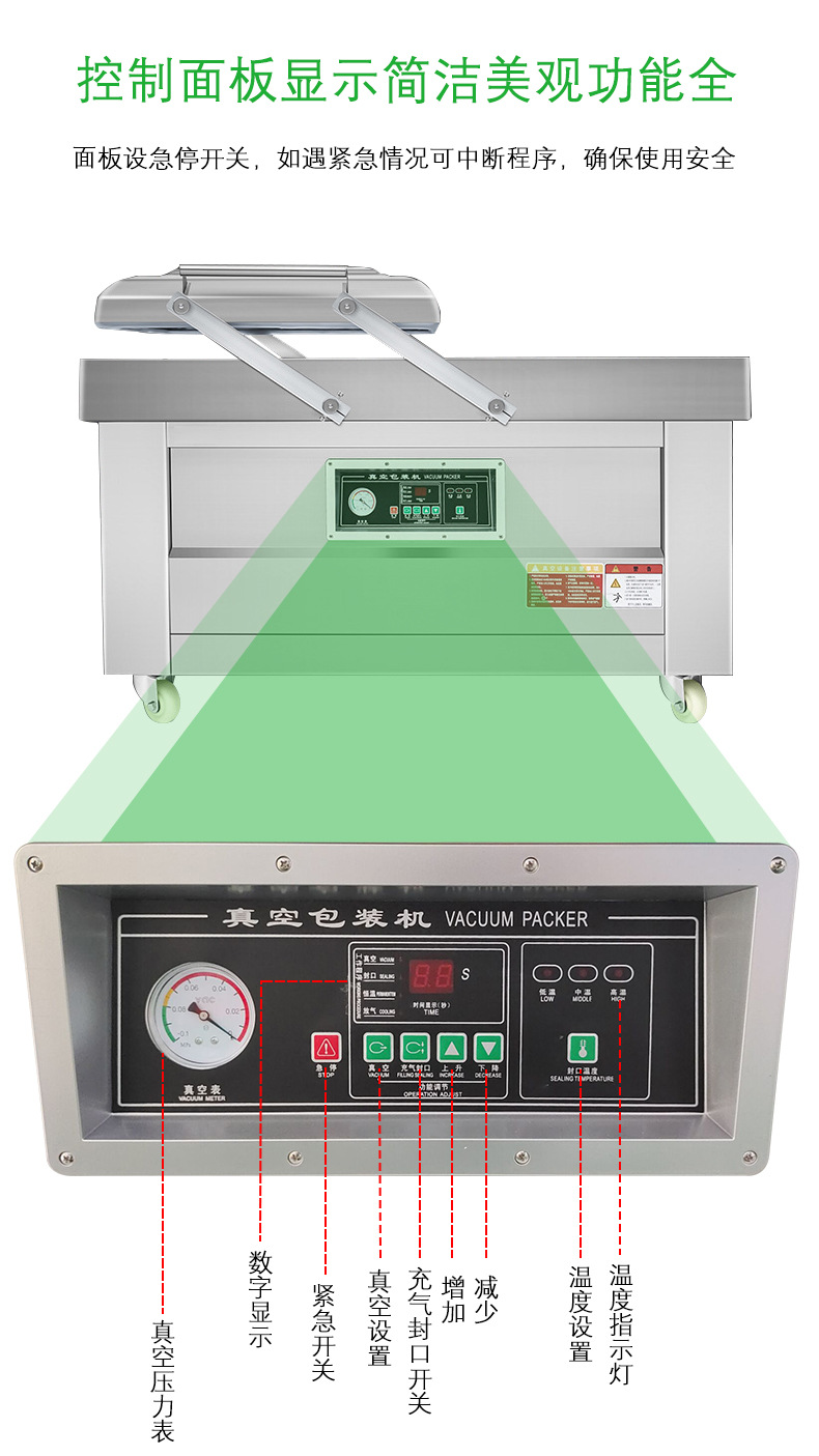 • 操作精準:配備先進的控制系統,如微電腦控制或彩屏觸摸式操作界面,可精確控制真空度、封口溫度和時間等參數,確保包裝質量穩定。