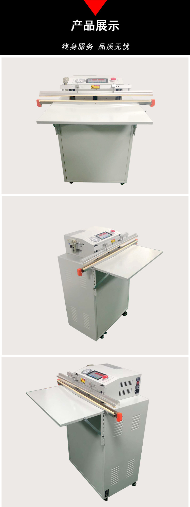電動外抽真空包裝機通過抽氣嘴放到被包裝物的包裝袋內,抽空空氣,退出抽氣嘴,然后完成封口,實現抽真空包裝的全自動化