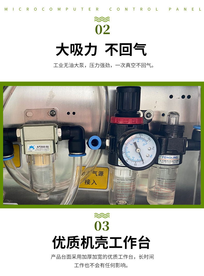 2. 精準的控制:可以精確調節抽真空的程度和封口的溫度、時間等參數,滿足不同物品的包裝需求。