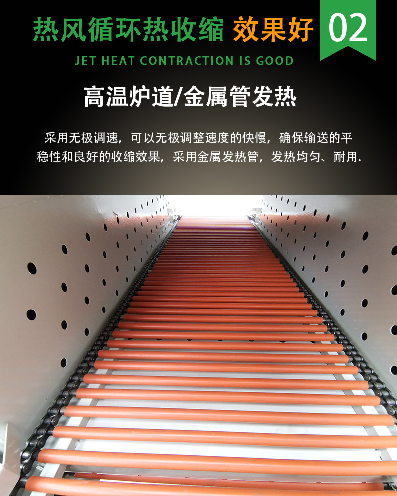 熱收縮機具有以下功能特點: 一、包裝功能 緊密貼合包裝:熱收縮機能夠利用熱收縮薄膜遇熱收縮的特性,將薄膜緊密貼合在被包裝物品的表面。無論是規則形狀還是不規則形狀的物品,都能通過選擇合適的薄膜及調整相關參數,實現薄膜與物品的完美貼合,形成光滑、平整的包裝外觀,有效防止灰塵、濕氣等外界因素進入包裝內部,起到良好的保護作用。 組合包裝:可以將多個相同或不同的物品進行組合包裝。比如在食品行業,能把多瓶飲料、多包零食等組合在一起進行熱收縮包裝,便于運輸和銷售,同時也增加了產品在貨架上的展示效果,提高產品的整體辨識度
