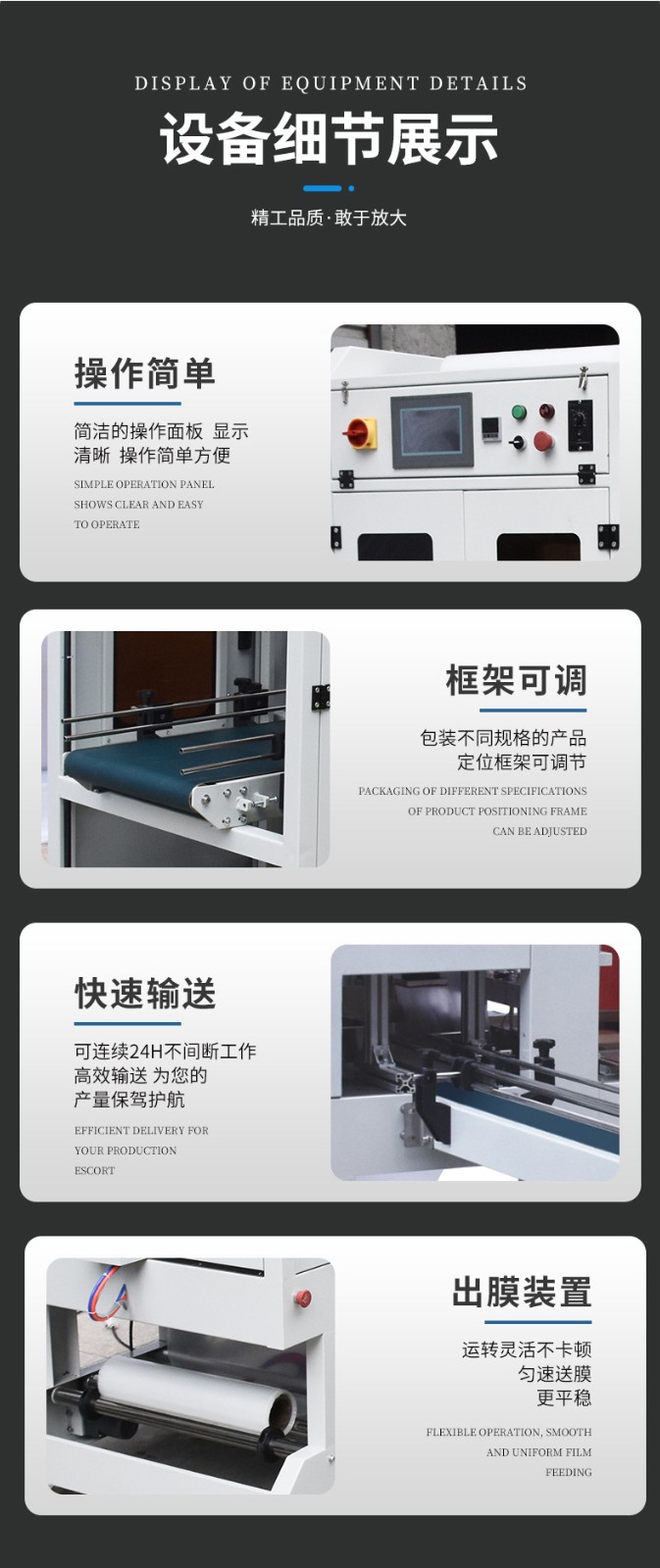 • 適應性與靈活性:這種包裝機對產品的形狀、尺寸和包裝材料的適應性較強。它可以通過簡單地調整機器參數來包裝各種形狀(如正方體、長方體、圓柱體甚至不規則形狀)和不同尺寸的產品。同時,它能夠兼容多種包裝材料,包括不同厚度、材質的塑料薄膜等。相比一些專用包裝機,它的靈活性更高,能夠滿足企業多樣化的包裝需求。