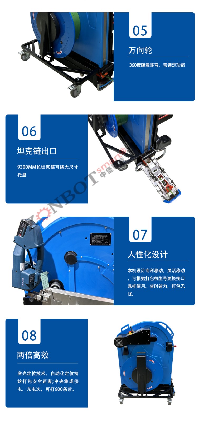 • 導向系統:由多個導向輪和導軌組成。導向輪一般是可以靈活轉動的滾輪,它們可以根據打包帶的寬度和穿帶路徑進行調整。導軌則是為打包帶提供了一個固定的通道,確保打包帶沿著預定的路線行進。比如,當打包帶需要轉彎時,導向輪會將其引導到合適的軌道上。