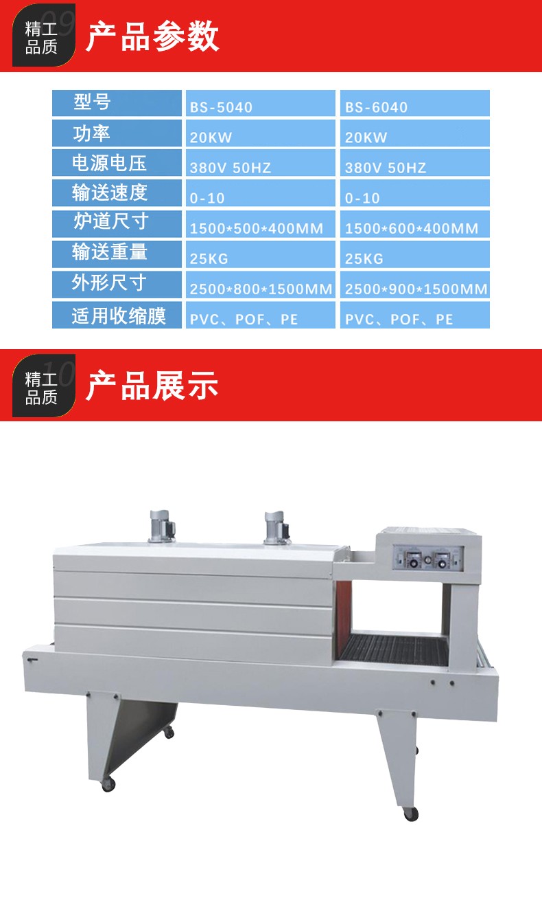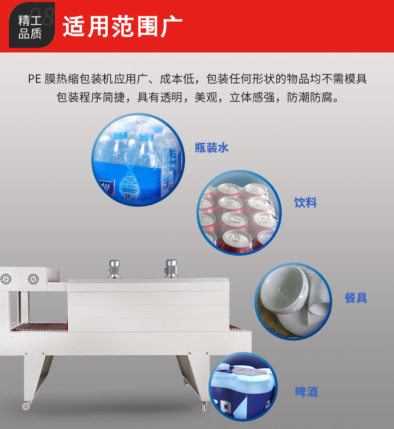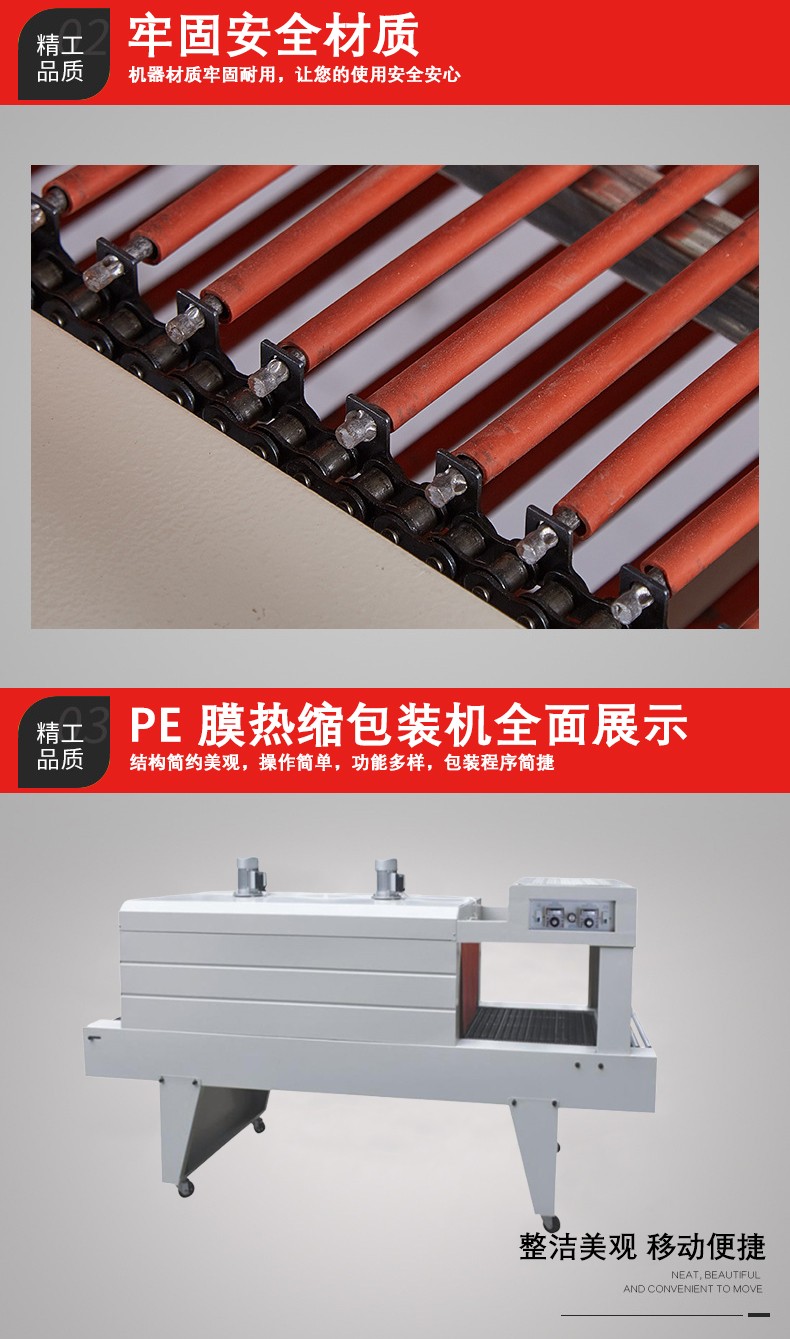 • PE 薄膜本身具有良好的柔韌性,再加上 PE 熱收縮機可以通過調節輸送速度、加熱溫度等參數,使得它能夠對各種形狀(如圓形、方形、不規則形狀)和尺寸的產品進行包裝。例如,無論是包裝小型的文具,還是大型的工業零部件,PE 熱收縮機都能發揮作用。