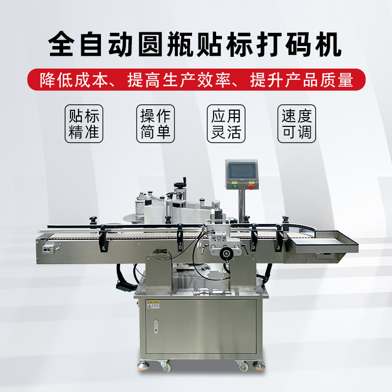 全自動圓瓶貼標打碼機是一種集貼標和打碼功能于一體的自動化設備,廣泛應用于食品、醫藥、日化等行業。 以下是其詳細介紹: 功能特點 貼標功能:可在圓瓶的圓周面、圓錐面、雙側面等位置進行貼標,可貼單標或雙標,正背雙標間距可靈活調整。 打碼功能:可在標簽上打印生產日期、批號、有效期、條形碼、二維碼等信息,滿足不同行業的標識需求。 自動化程度高:采用先進的傳感器和控制系統,可實現自動送瓶、貼標、打碼、收瓶等功能,無需人工干預,提高生產效率和貼標質量。 適應性強:可適應不同規格、形狀的圓瓶,通過調整設備的參數和更換相