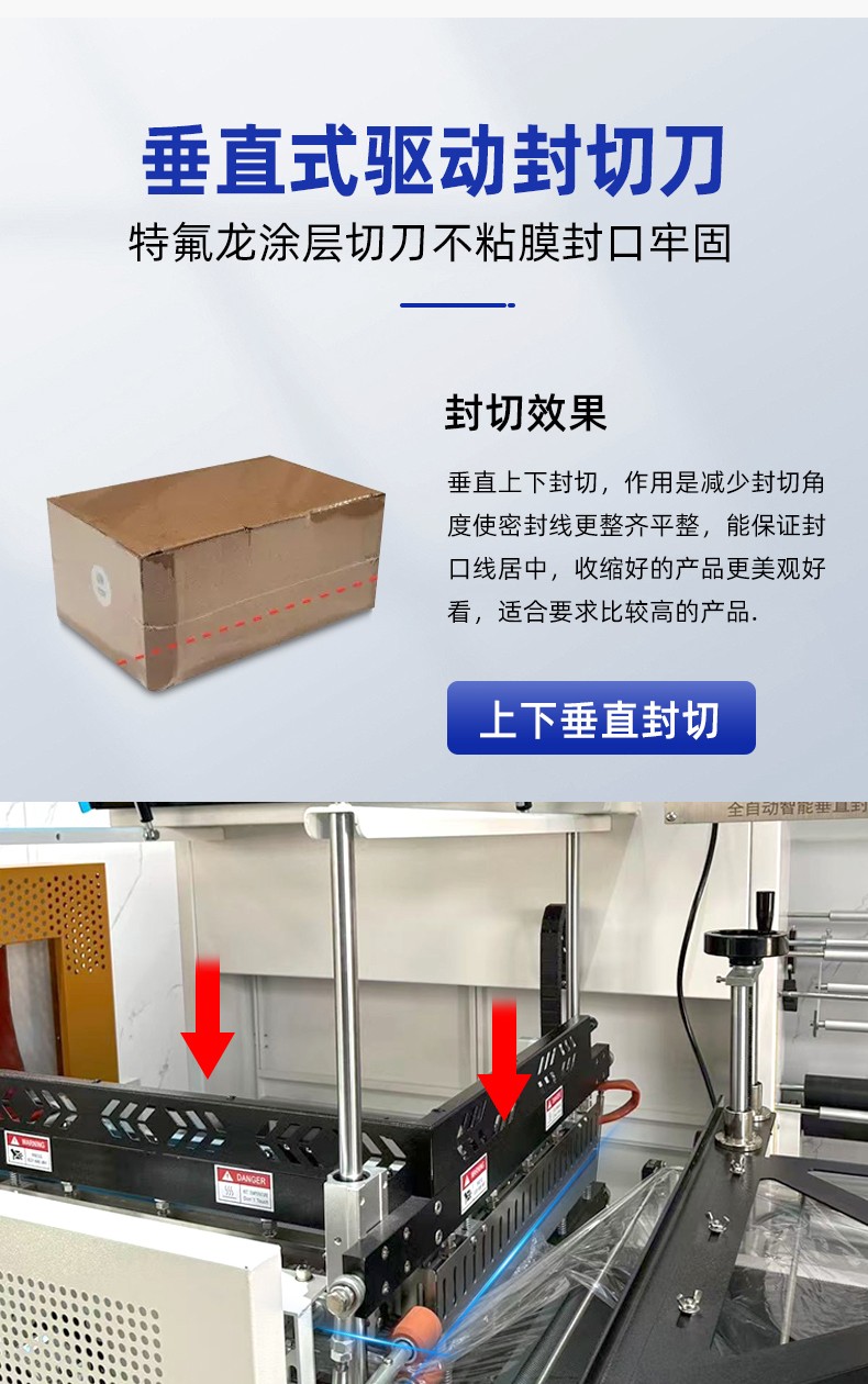 設備核心部件,采用垂直方向上下封切刀(區別于 “水平封切” 的橫向切割),可根據產品高度自動調整封切位置,適用于高度差異較大的產品(如瓶裝飲料、盒裝藥品);刀體通常帶 “防粘涂層”(如特氟龍),防止膜材高溫粘連,同時配備冷卻系統,避免封切后膜邊變形。
