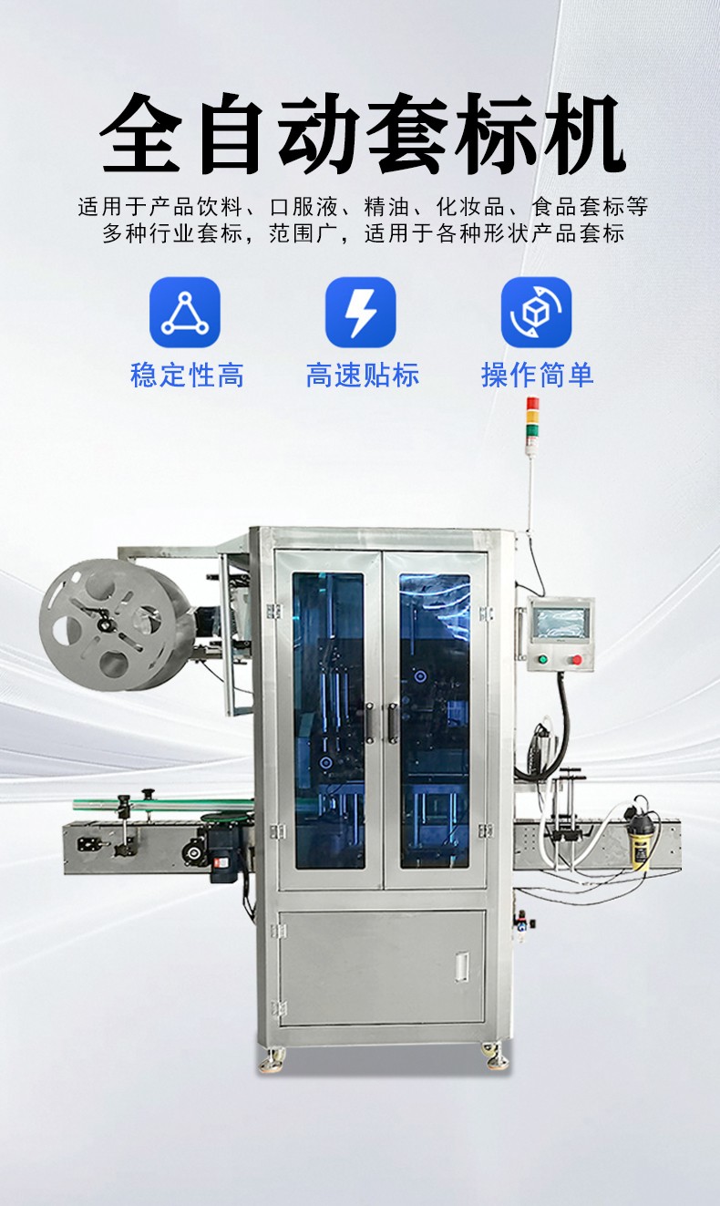 工作原理:全自動套標(biāo)機(jī)通過程式控制系統(tǒng)或電力控制系統(tǒng)實(shí)現(xiàn)自動檢測、標(biāo)簽取放、自動套標(biāo)等功能。其工作過程一般為,首先容器通過輸送帶系統(tǒng)輸送至套標(biāo)位置,標(biāo)簽收卷系統(tǒng)將標(biāo)簽卷展開,經(jīng)過送標(biāo)組將標(biāo)簽準(zhǔn)確地輸送到切刀位置,切刀按照設(shè)定的尺寸將標(biāo)簽切斷,然后通過貼標(biāo)頭部分將切斷的標(biāo)簽套在容器上,最后可能還會有熱收縮等后續(xù)處理工序,使標(biāo)簽緊密貼合在容器上。 結(jié)構(gòu)組成 輸送機(jī)構(gòu):包括輸送帶、帶瓶定位皮帶、分瓶螺桿等,采用變頻器同步器控制各傳動馬達(dá),可通過調(diào)整一個旋鈕來輕松調(diào)整整機(jī)運(yùn)行速度,確保容器穩(wěn)定、準(zhǔn)確地輸送到套標(biāo)位