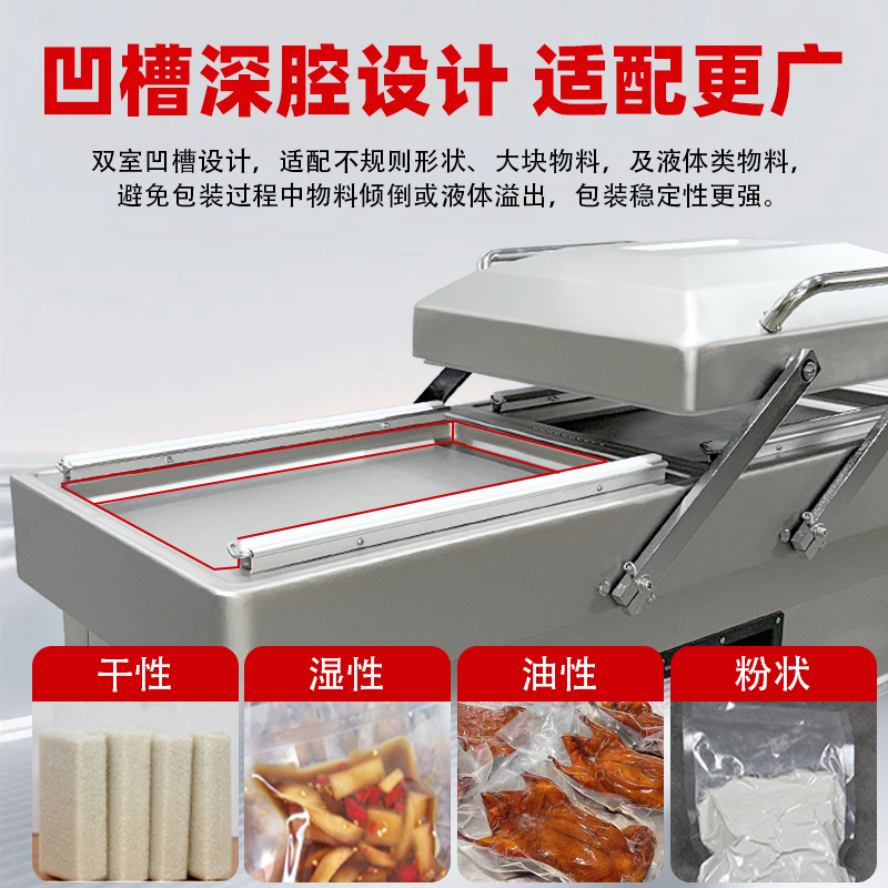• 適應帶湯汁或液體產品:下凹式設計能讓產品在包裝過程中處于傾斜狀態,有效防止湯汁或液體在抽真空時溢出,確保封口質量。