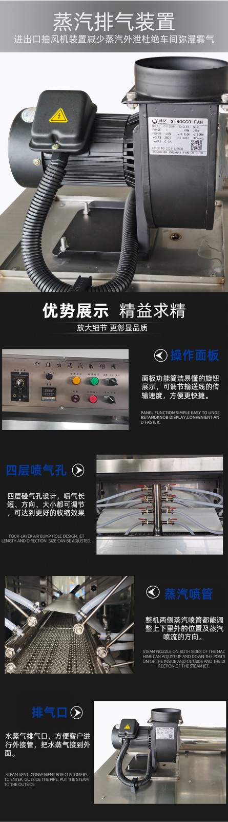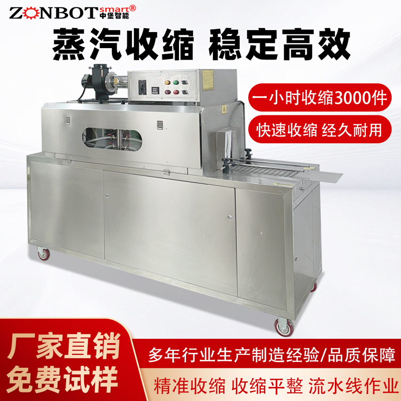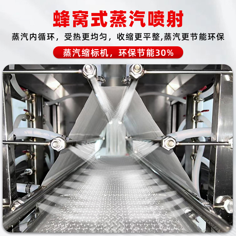 設(shè)備采用內(nèi)嵌式蒸汽發(fā)生模塊,摒棄傳統(tǒng)分體式設(shè)備的外置蒸汽發(fā)生器設(shè)計,將蒸汽制備、輸送、收縮環(huán)節(jié)高度集成在同一主機框架內(nèi)。這種設(shè)計不僅大幅壓縮設(shè)備整體占地面積(相比分體式方案節(jié)省 30%-50% 空間),還省去了蒸汽管道的鋪設(shè)與密封工序,從根源上降低蒸汽泄漏風(fēng)險,適配狹窄車間、流水線嵌入式工位等多種布局場景。