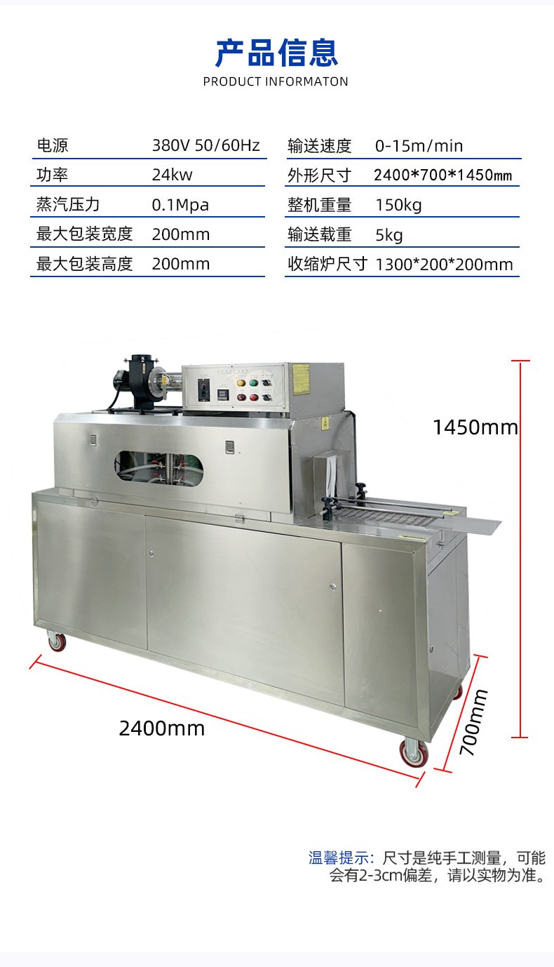 - 智能控溫,適配多類膜材配備 PLC 智能控制系統(tǒng),可精準(zhǔn)調(diào)節(jié)蒸汽溫度(50℃-120℃可調(diào))、輸送速度與蒸汽噴射量,兼容 POF、PVC、PE 等多種熱收縮膜材,滿足不同產(chǎn)品的包裝厚度與質(zhì)感要求。