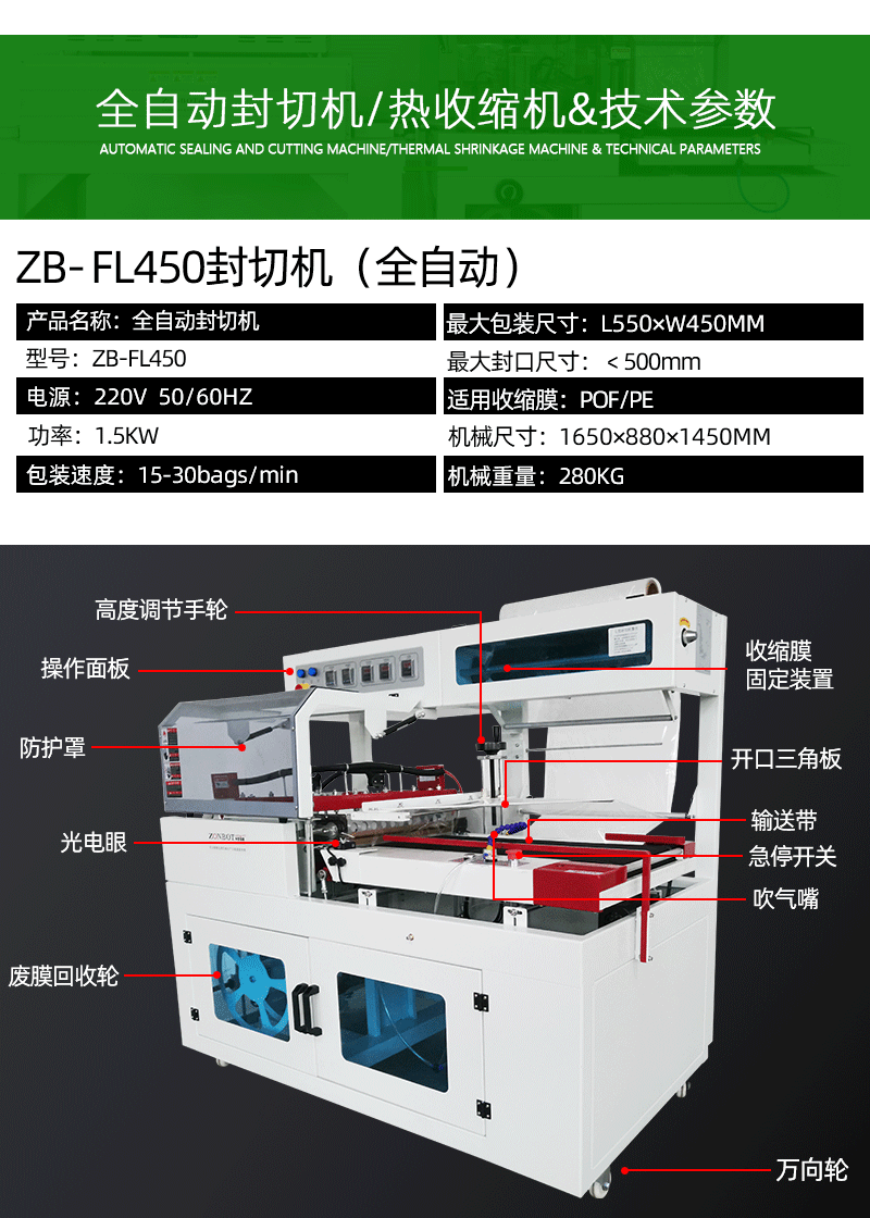 全自動(dòng)L型封切機(jī)采用環(huán)保材料制成,無污染、低噪音,既能降低使用成本,又能滿足綠色環(huán)保要求。讓您的企業(yè)形象更上一層樓!