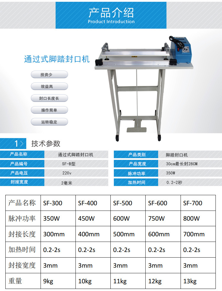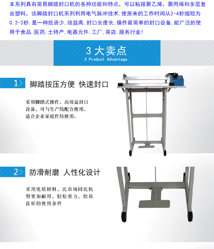 腳踏式封口機(jī)適用于各種塑料薄膜、復(fù)合薄膜及鋁塑薄膜的封合。產(chǎn)品簡(jiǎn)介 可廣泛應(yīng)用于食品、土特產(chǎn)、糖果、茶葉、醫(yī)藥、五金等行業(yè)。技術(shù)參數(shù) 產(chǎn)品優(yōu)點(diǎn) 1、本品適用于藥品,化妝品,保健品,食品,潤(rùn)滑油,農(nóng)藥,蜂蜜,瓜子,洗衣粉,大棗,調(diào)味品,雞精等